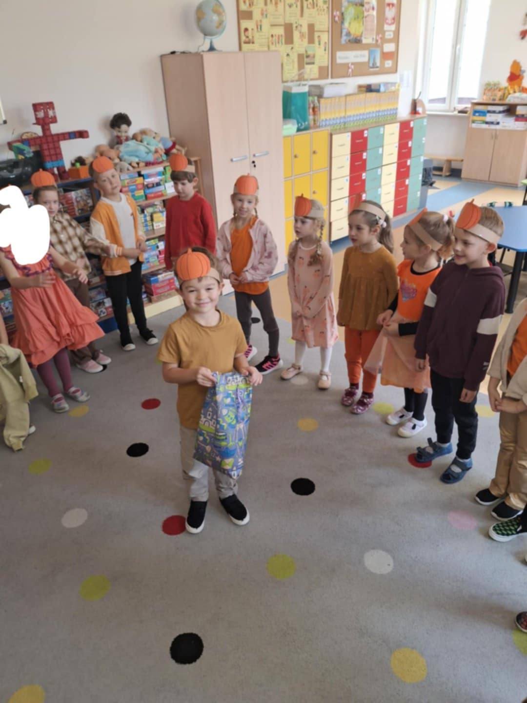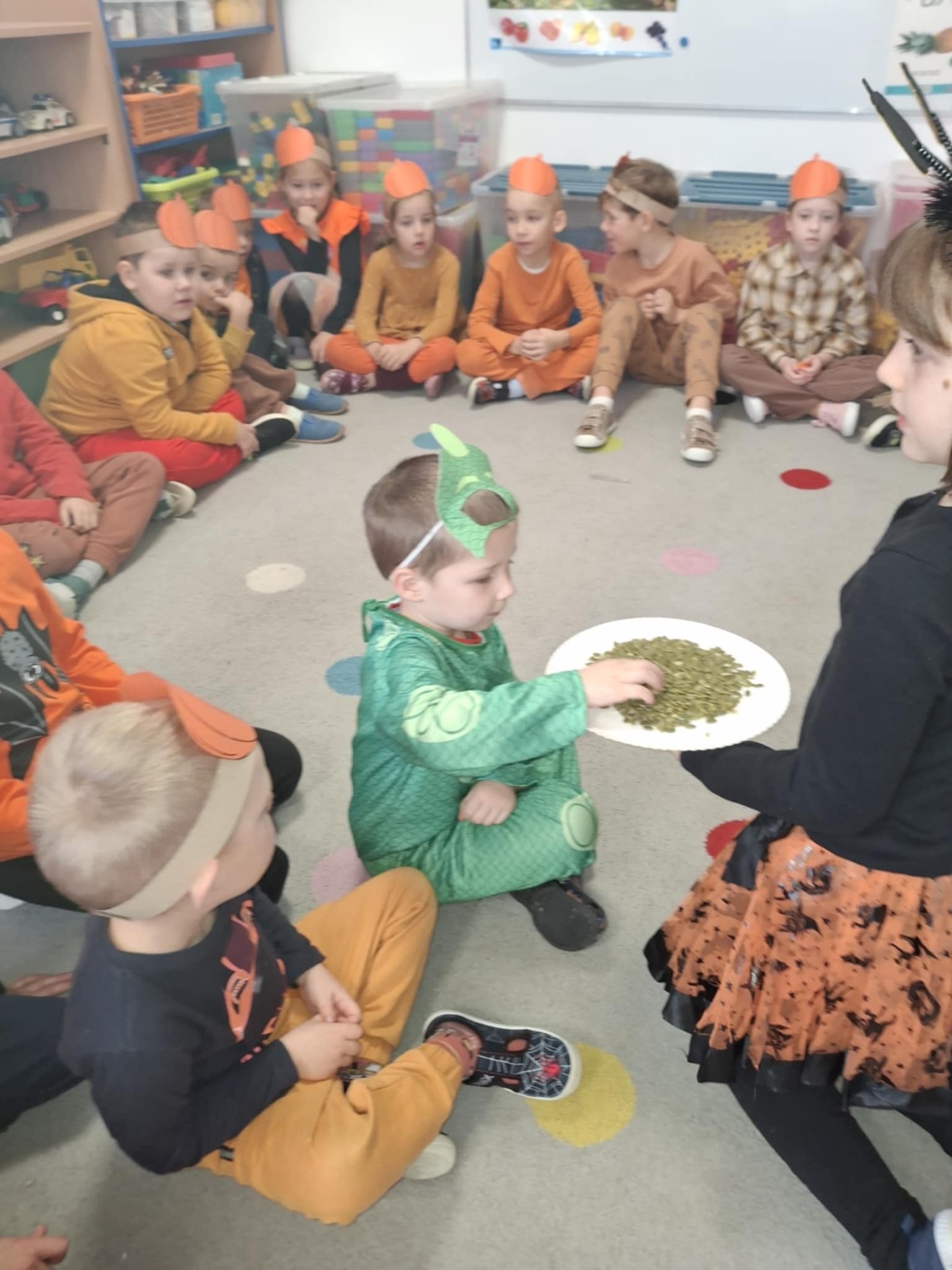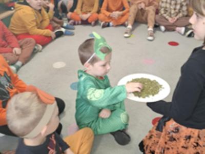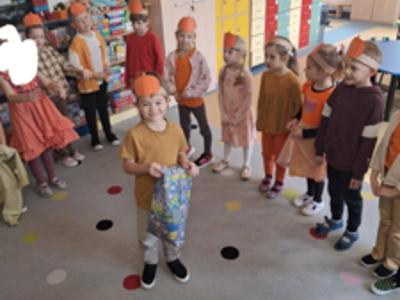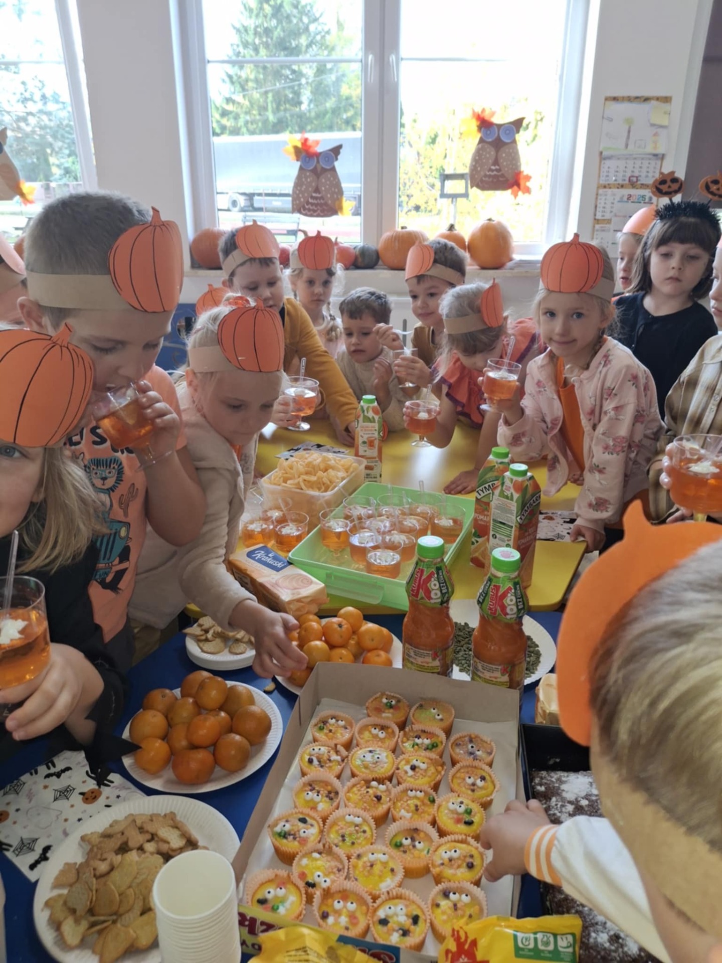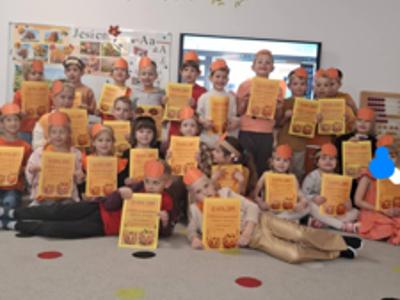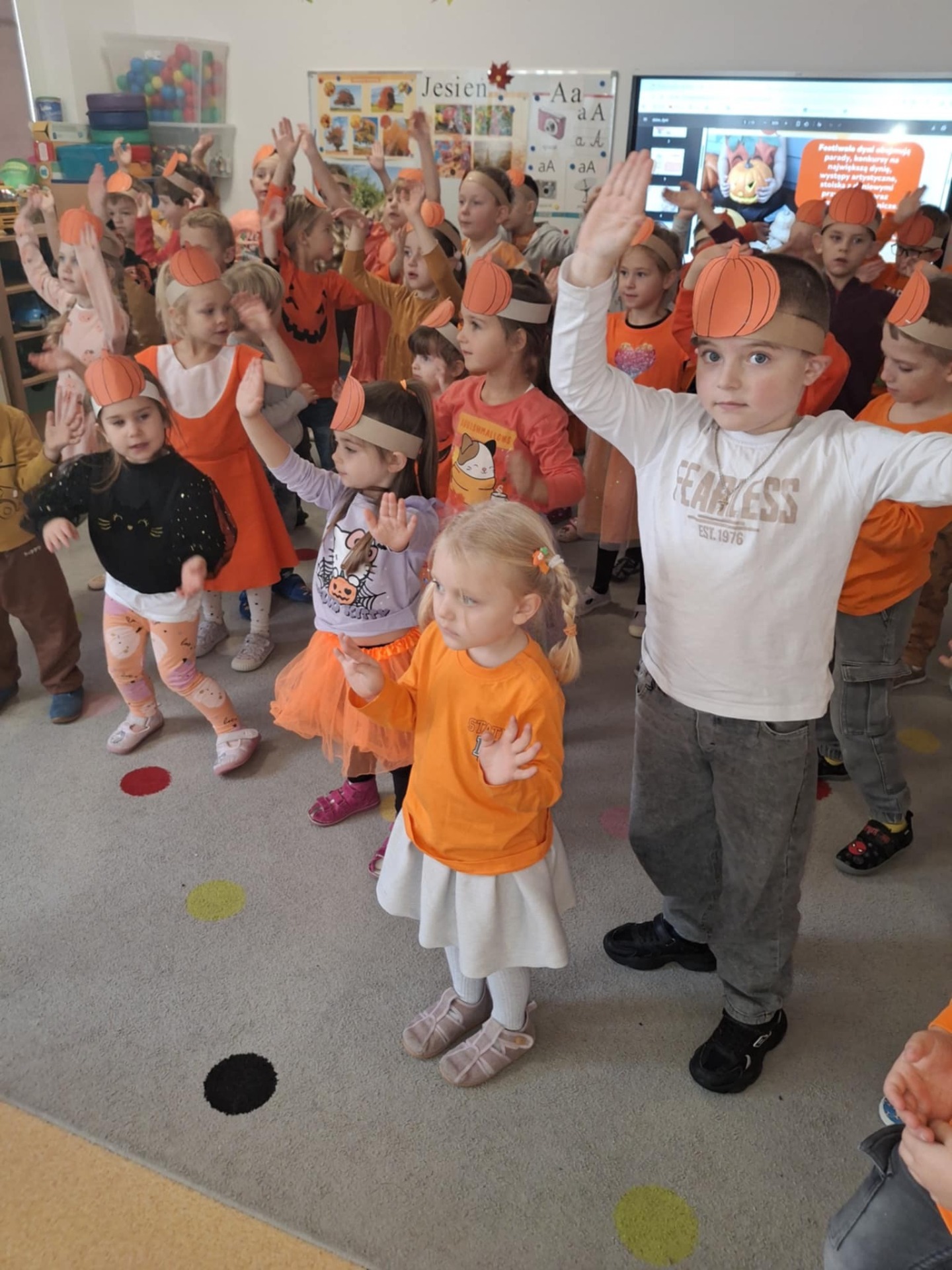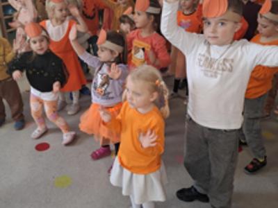 W czwartek 30 października w oddziałach przedszkolnych można się było poczuć, jak na dyniowej grządce.Tego dnia zdecydowanie królował kolor pomarańczowy, a sale przedszkolne przyozdobione były różnymi gatunkami dyń, przyniesionymi przez dzieci. Dzień rozpoczęliśmy od zajęć, podczas których dzieci poznawały wielką różnorodność dyń i wzbogaciły wiedzę na ich temat. Dowiedziały się, że dynia jest bardzo zdrowym warzywem i że można z niej przygotować wiele dań. Badaliśmy dynię: jej ciężar i wygląd. Wzięliśmy udział w licznych zabawach z udziałem dyni. Dzieci miały również okazję przekonać się, jak smakują dyniowe babeczki i marchewkowe