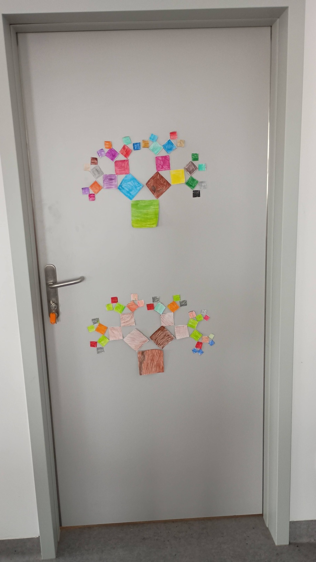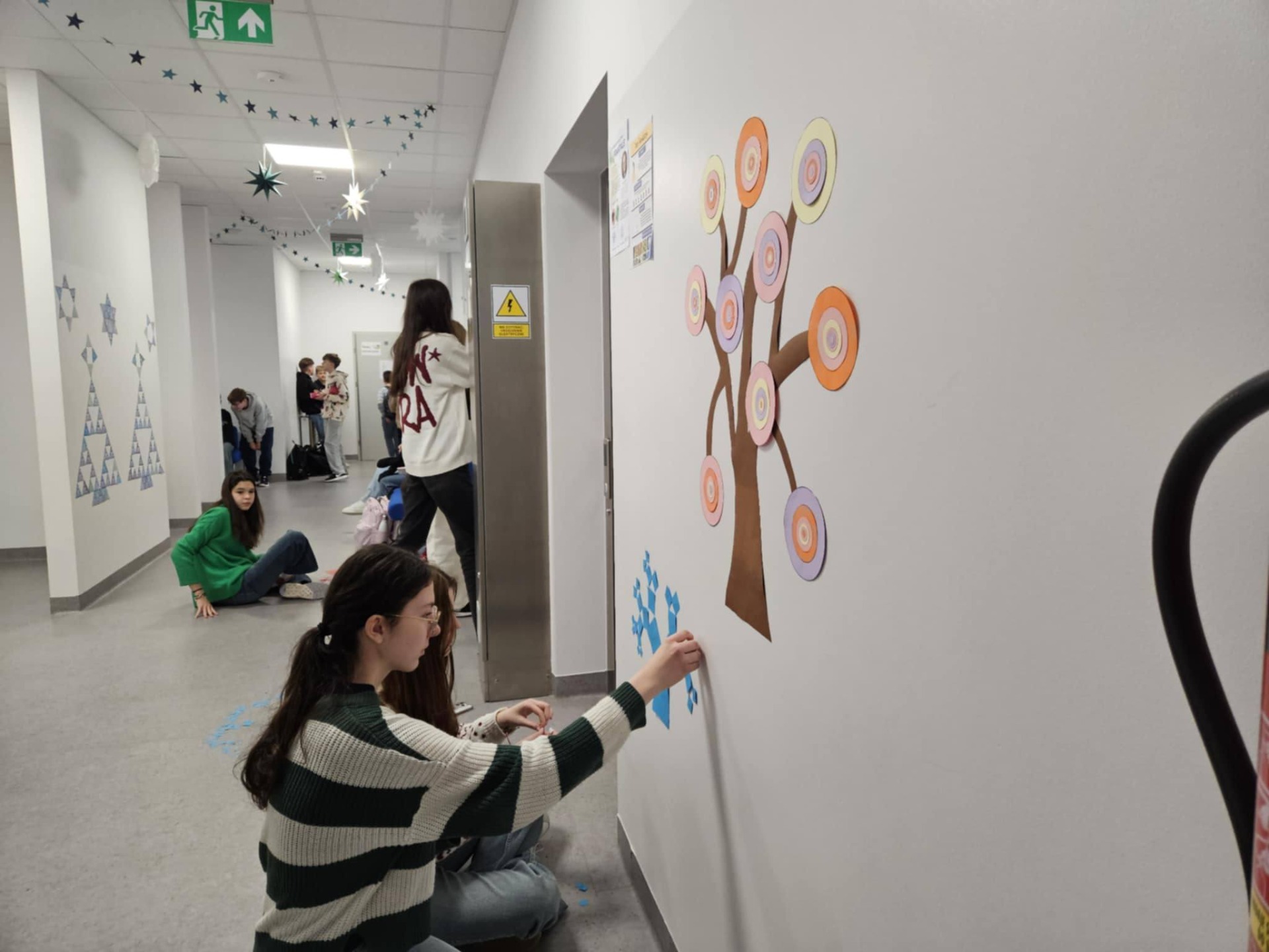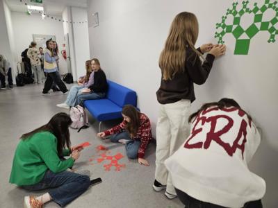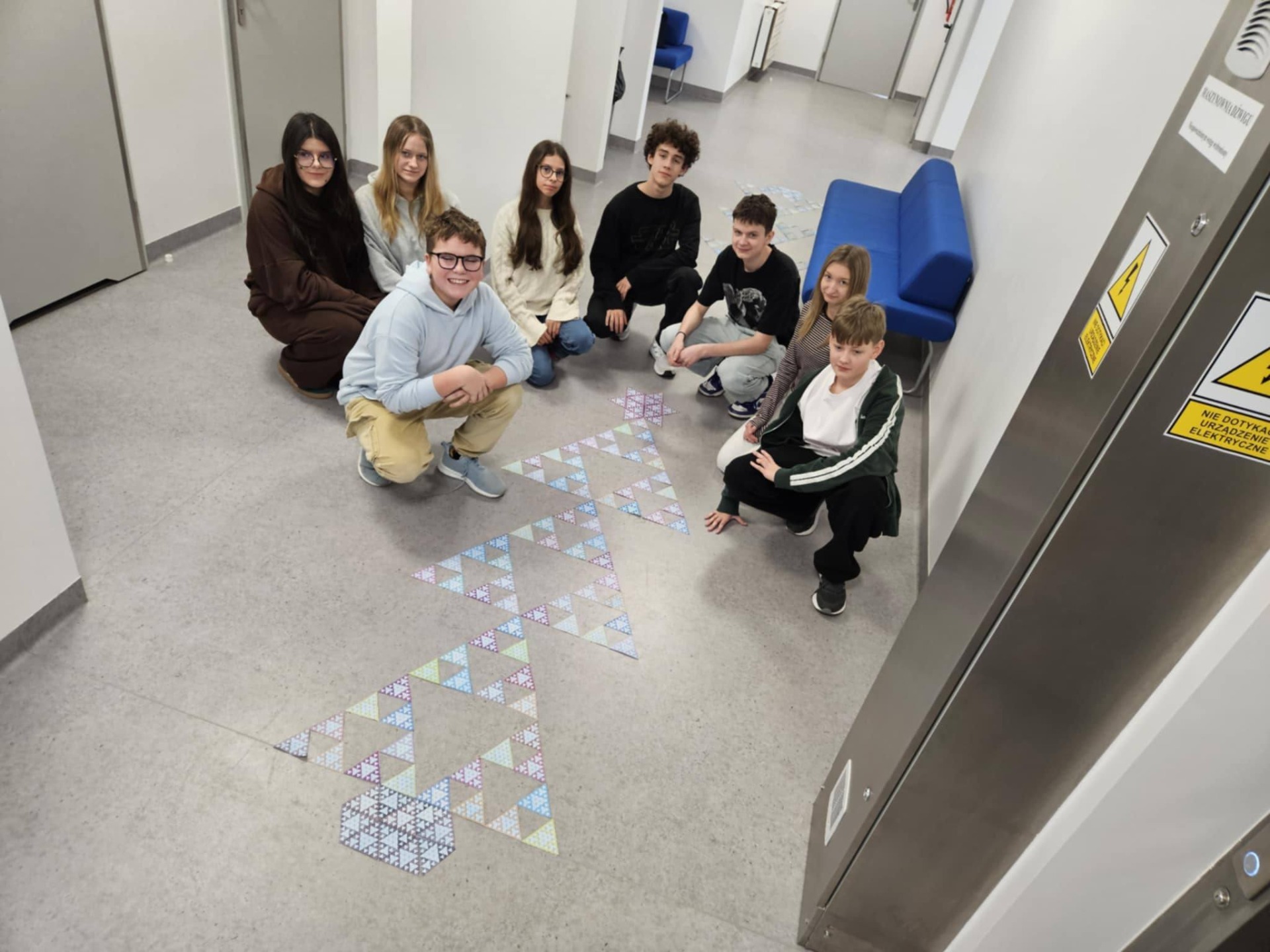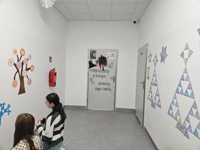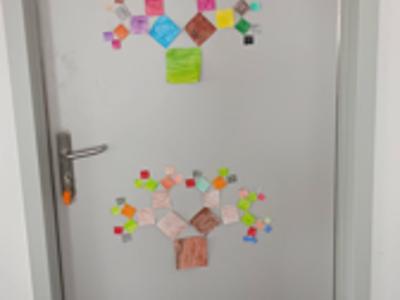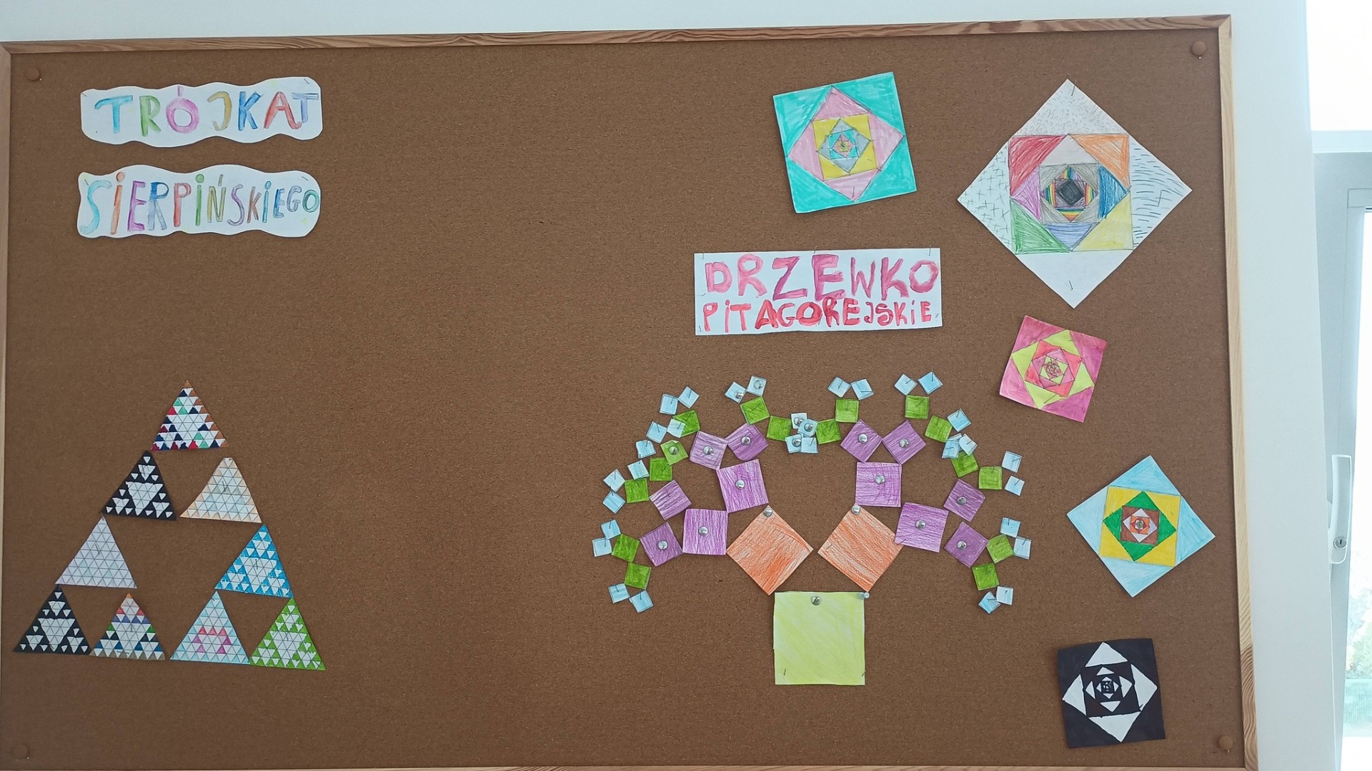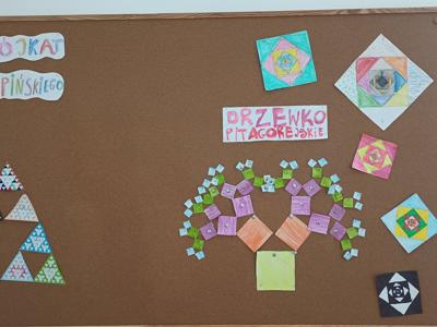 W listopadzie obchodzony jest Dzień Mandelbrota. Z tej okazji uczniowie klas 4, 5 i 8 dowiedzieli się, czym są fraktale i wykonali samodzielnie te najbardziej znane, czyli trójkąt Sierpińskiego i drzewko pitagorejskie. Wykonane prace można było podziwiać w sali nr 5, a uczniowie klasy 8 ozdobili nimi świątecznie korytarz.