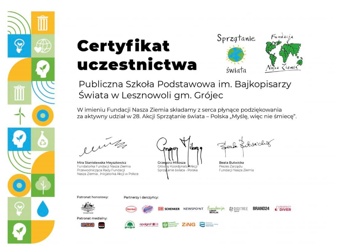 Niech ten certyfikat dla naszej szkoły przypomina o wspólnych działaniach w 2021 roku na rzecz naszych najbliższych okolic i ogólnopolskiej lekcji nieśmiecenia, a hasło tegorocznej akcji, „Myślę, więc nie śmiecę!” pozostanie z nami na dłużej i będziemy je dalej wspólnie promować w naszych codziennych ekologicznych działaniach.