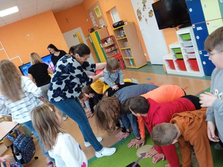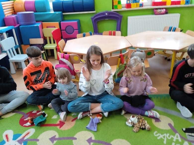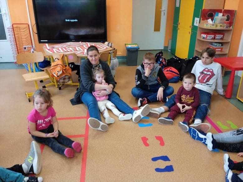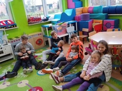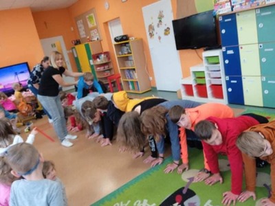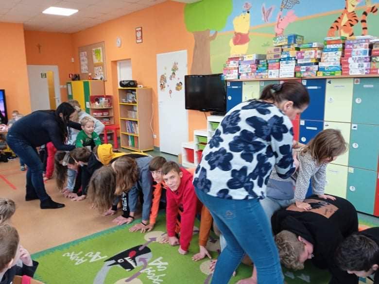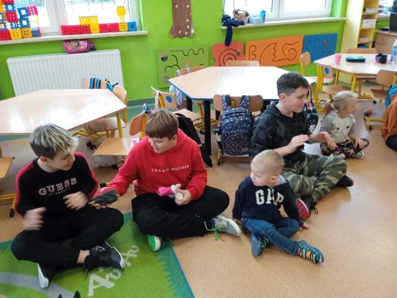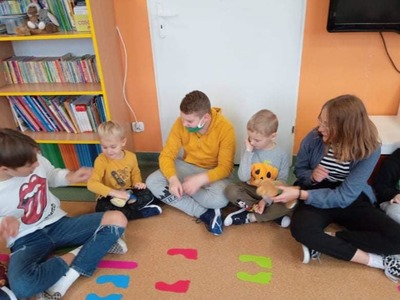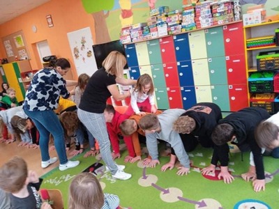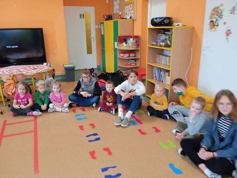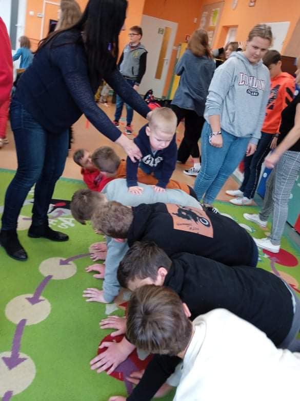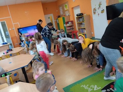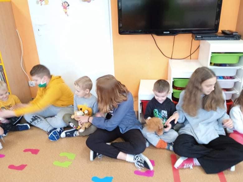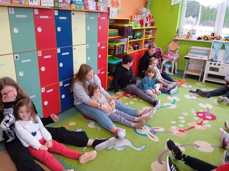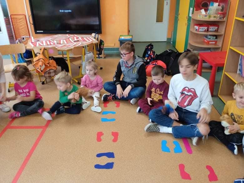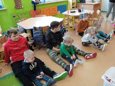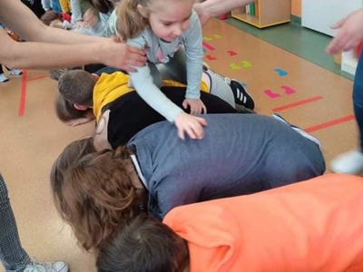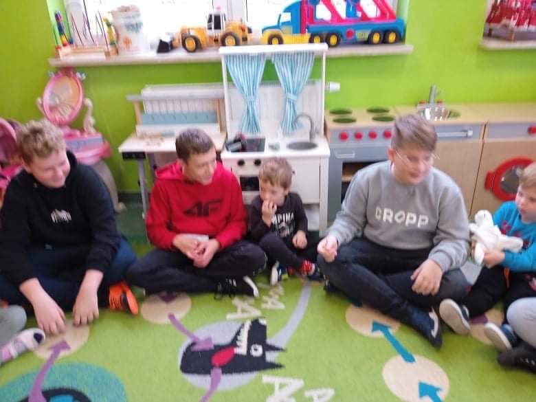 We wtorek 9 listopada, uczniowie klasy 7b odwiedzili przedszkolaków. Wspólnie z dziećmi bawili się w wystukiwanie rytmu, przekazywanie maskotki w prawą lub lewą stronę i kołysanie w rytm muzyki. Na końcu zajęć, przedszkolaki z wielką radością przeszli się po moście zrobionym z pleców starszych kolegów i koleżanek ![]()